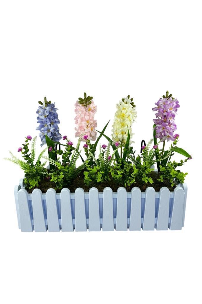 Yapay Çiçek Renkli Sümbül Çiçekleri Beyaz Çit Saksıda Küpeşte Askılı Balkon Çiçeği Çiçek Sepeti